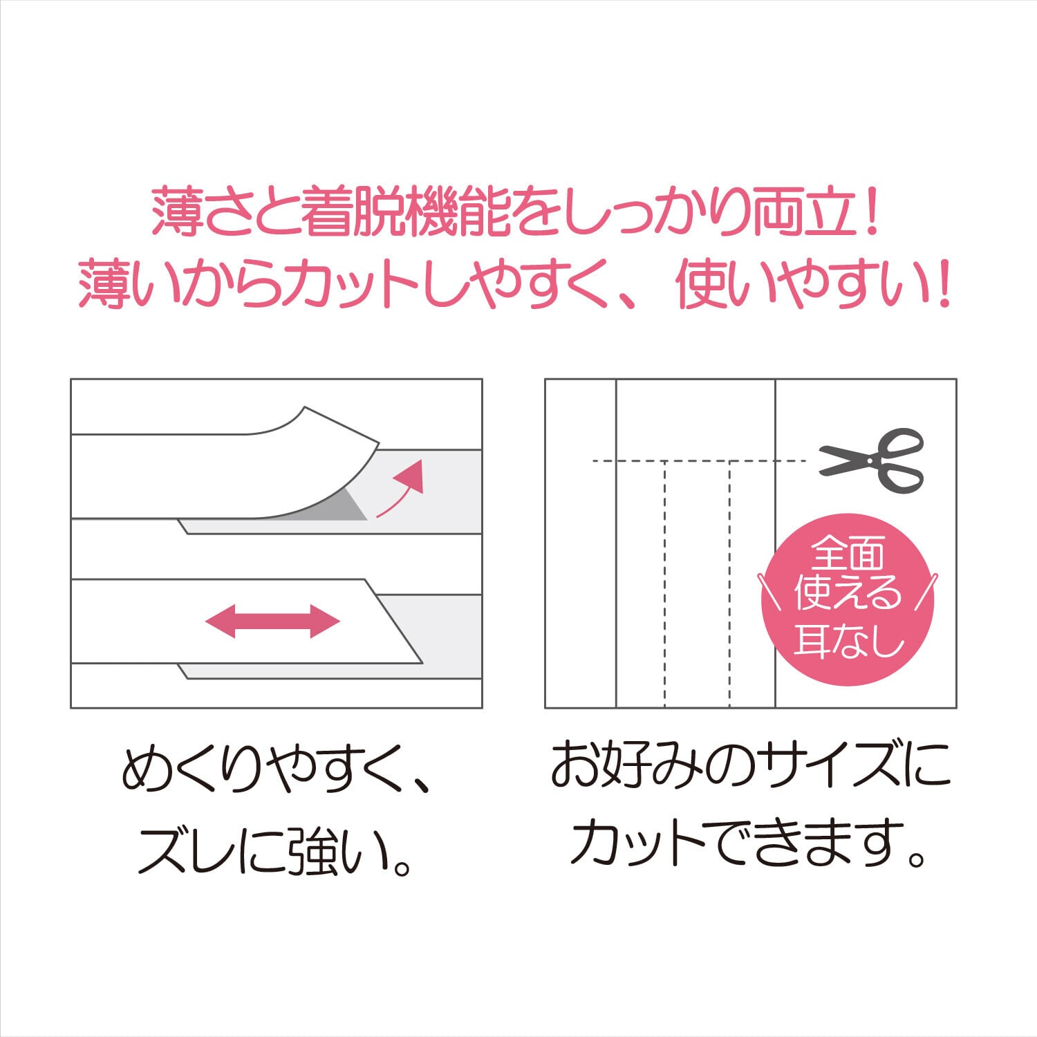 ループ面はソフトな風合い、フック面はチクチクしにくい微細なマッシュルーム状。めくりやすく、ズレに強い構造です。